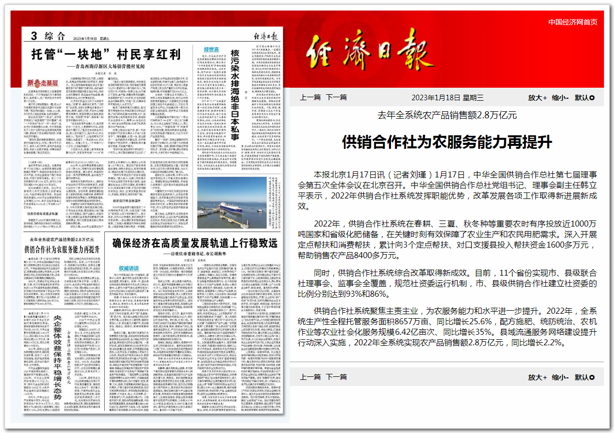 1月17日,中華全國供銷合作總社第七屆理事會(huì)第五次全體會(huì)議在北京召開。中華全國供銷合作總社黨組書記、理事會(huì)副主任韓立平表示,2022年供銷合作社系統(tǒng)發(fā)揮職能優(yōu)勢(shì),改革發(fā)展各項(xiàng)工作取得新進(jìn)展新成效。